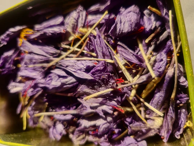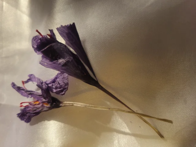 گل زعفران به طور کامل خشک شده . این گل خواص بینظیری دارد و تمام خواص زعفران ریشه
